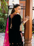 A classic and dramatic unstitched ensemble in bold Black Velvet. The shirt is richly embellished with intricate multicolored thread-work embroidery on the neckline, sleeves, and borders, creating a striking contrast. It is crowned with a dazzling Hot Pink Organza Dupatta, finished with a bold turquoise border and delicate embroidery for an unforgettable statement.