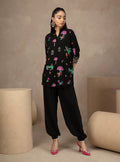 Who knew black could be this bright? Misty is a masterclass in playful contrast, featuring a curated collection of tropical icons—think hot pink fans and vibrant greenery—scattered across a sleek black backdrop. The contrast-trim sleeves and cuffed ankles give it a structured, modern finish that’s totally photo- ready.