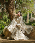 Roshan Ara' Dual Dupatta - An old School flared satin brocade Gharara with knee length shirt embellished with handmade latkans styled with Dual Dupatta Look; an off-white Organza Gota embellished dupatta and...