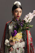 Mehruba is a sophisticated Anarkali crafted on a deep off-white base, featuring composed suzani floral sprays and hand-painted style paisleys that create a harmonious and artistic palette. The silhouette is enhanced by a wide-set hemline border with a unique blue-denim accent paired with traditional black-and-white ethnic scrolls, providing depth and visual intrigue. Coordinated ivory trousers with minimal floral detailing at the hem maintain a clean and balanced aesthetic, while a high-contrast moss green silk dupatta, bordered with a regal suzani-patterned frame and monochromatic outer edge, completes the ensemble. Mehruba exudes artisanal craftsmanship, timeless elegance, and contemporary heritage sophistication, making it a statement Anarkali for discerning wardrobes.