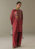 A rosewood shirt inspired by intricate cross-stitch embroidery, paired with matching rosewood trousers for a refined, monochromatic look. The outfit is elevated with a bold, colorful paisley shawl that adds vibrance and a touch of artistic flair, creating a perfect balance of tradition and contemporary charm.