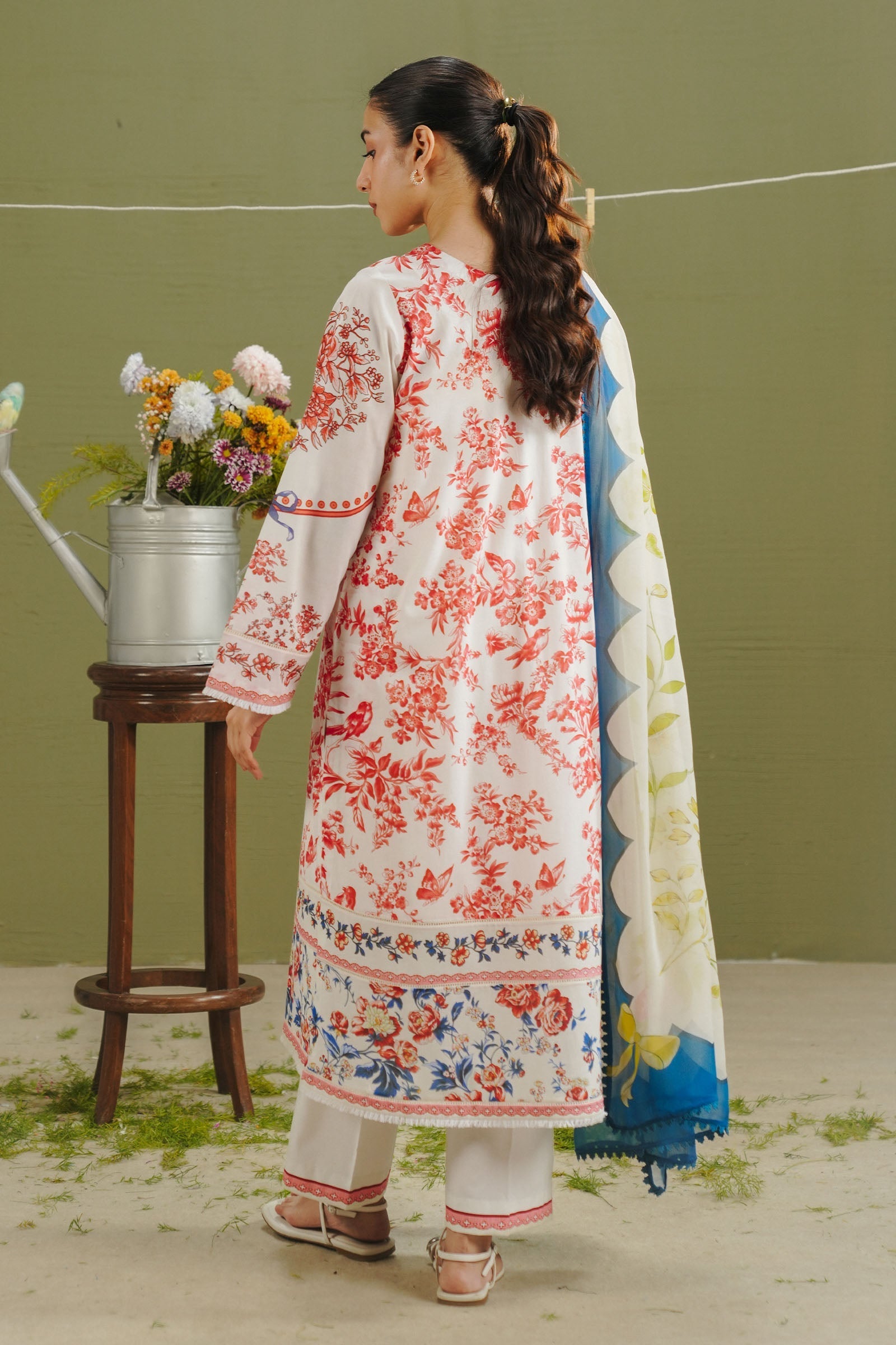The dupatta features a neatly arranged floral print with a blue scalloped border on pearl white. The shirt carries cherry red floral prints on a pearl white base. The trouser is finished with a pink lace border on pearl white.