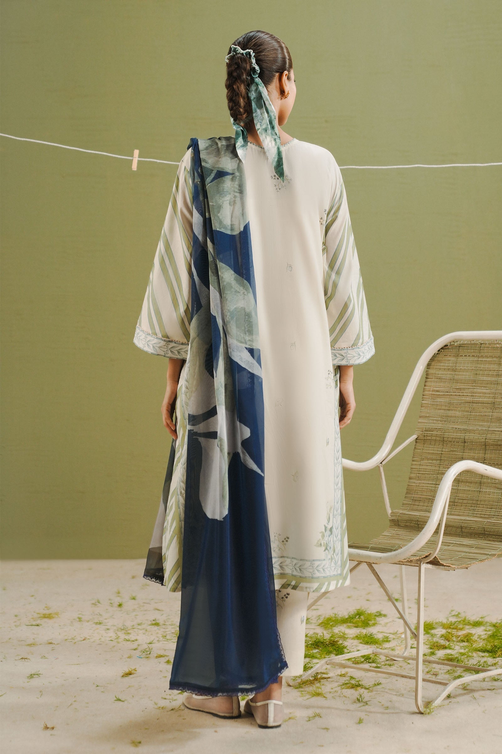 An off-white dupatta is printed with delicate floral motifs. The shirt combines olive green stripes with floral detailing on an off-white base. The trouser feature a subtle floral print on off-white for a coordinated finish.