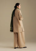 A deep mocha khaddar shirt and trouser paired with an olive green shawl, a grounded mix of warmth and ease for winter days.