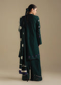 An emerald green khaddar shirt and trouser paired with a shawl in emerald green and purple, a regal blend of tones that carries depth and winter richness.