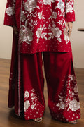 Mahfila is a vibrant red Korean silk ensemble that exudes festive grandeur and sophisticated craftsmanship. The kurta is fully embroidered in intricate gara patterns, showcasing meticulous artistry and a rich visual texture. Paired with an asymmetrically embroidered farshi shalwar, the silhouette flows gracefully while offering a contemporary edge.