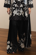 Shabina is a striking black silk ensemble that exudes bold elegance and refined craftsmanship. The kurta is fully embroidered in intricate gara patterns, creating a rich tapestry of artisanal detail. Paired with an asymmetrically embroidered farshi shalwar, the silhouette flows gracefully while maintaining a contemporary edge.