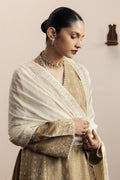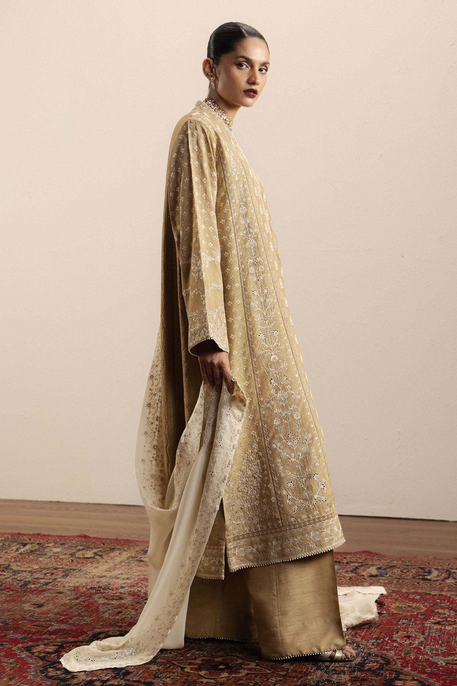 An antique gold ensemble that effortlessly exudes grace and understated luxury. The medium raw silk shirt is richly adorned with full-front embroidery, featuring a captivating mix of tilla and resham detailing that brings depth, texture, and a regal aura to the design.
