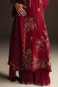 Ayra is a dark burgundy ensemble that exudes quiet sophistication. The shirt showcases intricate embroidery in moss green and beige tones, enhanced with subtle satin finishing that adds a gentle play of texture. Paired with straight-fit pants and a rich silk dupatta edged with scallop detailing, this look is timeless, versatile, and undeniably elegant.