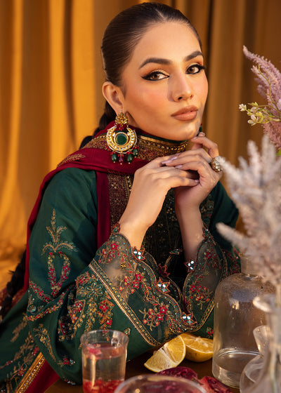 ZAREEN — opulence reimagined in emerald green. Rich textures and meticulous embroidery come alive on rawsilk, while the matching dupatta lends movement and fluidity. Bold yet regal, this outfit is a nod to heritage with a distinctly modern gaze — commanding, classic, and unforgettable.