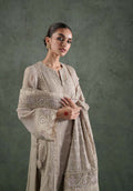 Drenched in the tranquil elegance of pastel oyster grey pink hues, 'Hazel' manifests as a vision of ethereal beauty. Its delicate tulle canvas is adorned with glistening tilla embroidery and intricately woven threads in shades of sage, ivory, and periwinkle, complemented by lustrous pearls and sequin accents, with delightful touches of silver and gold. Harmoniously paired with tonal trousers and a resplendent dupatta, adorned with a meticulously embroidered border, this design exudes feminine charm and playful allure, making it the perfect choice for sophisticated daytime celebrations.