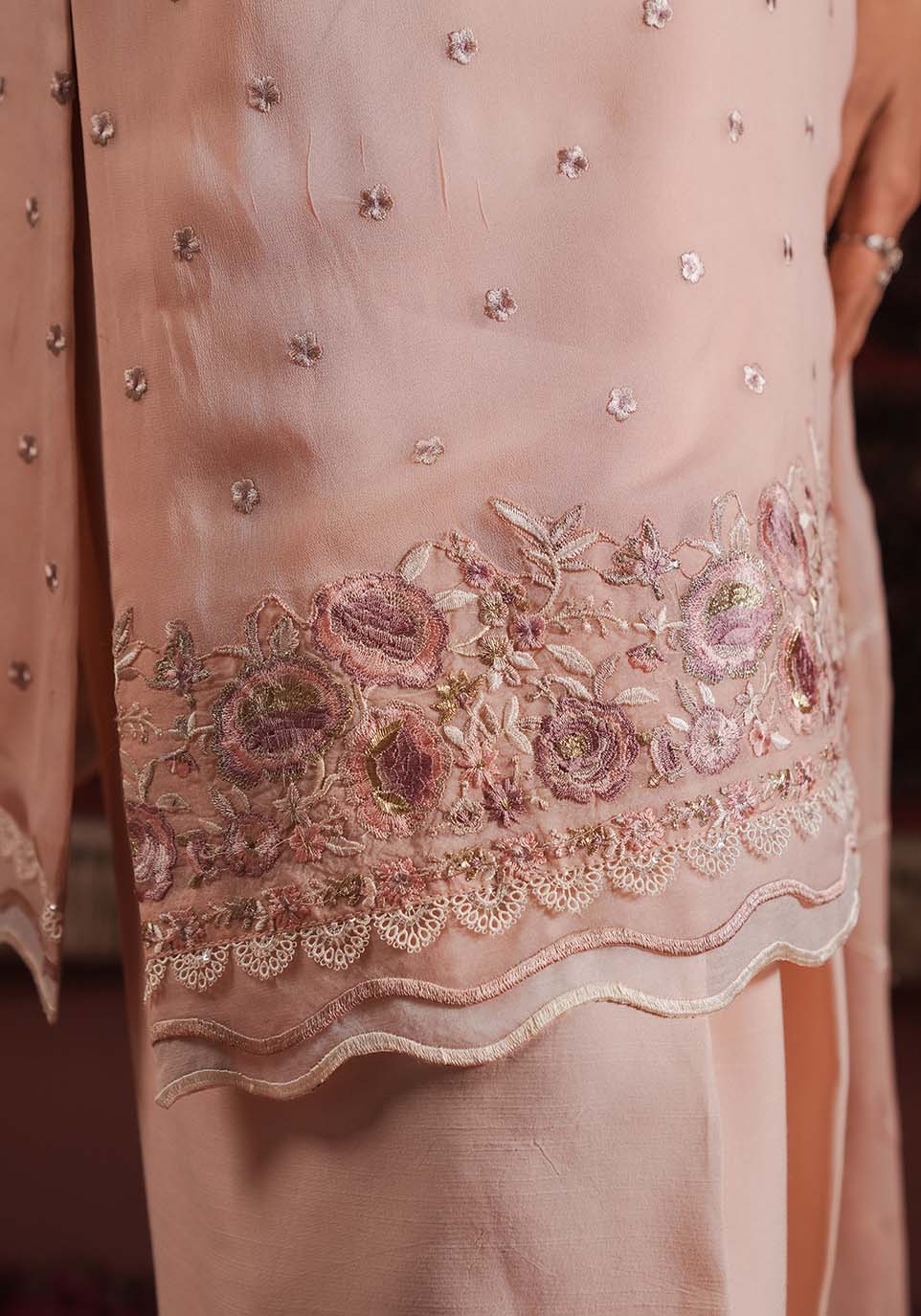 Experience the opulent allure of 'IZEL': a tapestry of exquisite craftsmanship unveiled on an obsidian canvas adorned with intricate ghara embroidery, glowing in the luminous hue of rose pinks ivory and sage. Each stitch tells a story of unparalleled elegance and sophistication. The shirt is further enhanced by an array of intricately embroidered borders in contrasting colors, adding depth and definition to the design. Paired with a stunning signature Embroidered Chiffon dupatta featuring beautiful ghara art in vibrant hues, 'IZEL' transcends traditional festive chiffon aesthetics, offering a statement ensemble that exudes unparalleled style and sophistication.