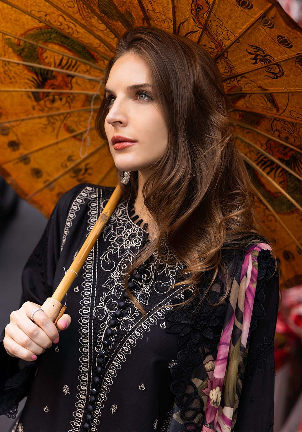 Elevate your summer wardrobe with “Eliana”-a masterpiece that exudes an aura of refined elegance and quiet strength. Draped in a sumptuous ebony canvas, this opulent design is adorned with meticulously crafted ivory and black laser appliqué motifs, brought to life with delicate floral embroideries in soft hues of ivory, charcoal, and a whisper of rose-pink. Every detail showcases unparalleled craftsmanship, creating a symphony of timeless allure. Accompanied by tonal cotton pants and an impeccably crafted digital printed dupatta adorned with delicate and intricate embroidered borders and motifs. “Eliana” is a sartorial ode to regal sophistication.