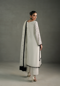 Embodying the spirit of minimalism, "ESTELLA”, is a stunning example of refinement, crafted from a luxurious ivory raw silk fabric. The ensemble is enhanced by intricate ebony sequins embroidery, adding depth and elegance to its design. Paired with a dupatta featuring a four-sided silk border and delicate ebony sequins work, along with matching tonal trousers, this timeless creation effortlessly blends sophistication with enduring style.