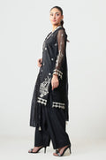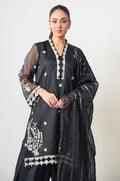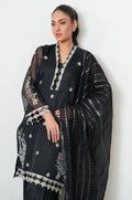 Channel your inner elegance with the Onyx 3-piece embroidered suit, featuring deep black tones that exude mystery and allure. The embroidered Rajjo Net dupatta and intricate lace borders enhance its lavish appeal, while the embroidered panels for the front and sleeves create a truly regal look. Paired with a dyed slip and trouser, this luxurious outfit is designed to make a lasting impression. Perfect for formal occasions, the Onyx suit combines modern styling with timeless sophistication.