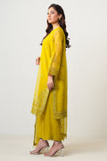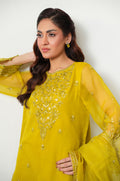 Revitalize your wardrobe with the cheerful Lime Delight Lemon embroidered 3-piece suit. Intricate embroidery graces the organza fabric across the front, back, and sleeves, enhanced by ornate borders. A dyed slip and raw silk trouser complement the vibrant ensemble. Hand embellishments bring subtle luxury to this masterpiece. This radiant formal suit is ideal for joyful celebrations and gatherings.