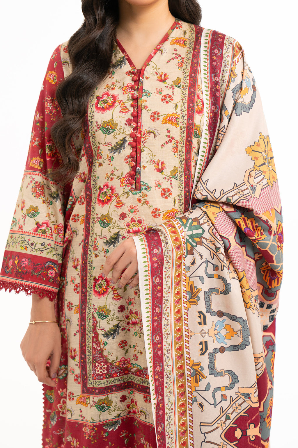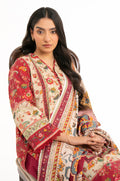 A refreshing pick for summer, this maroon colored 3-piece suit features a digitally printed khaddar shirt. Paired with a dyed khaddar bottom in the same hue, the suit is completed with a digital printed herringbone dupatta. This ensemble is a perfect pick for creating a breezy, soothing look for all occasions.