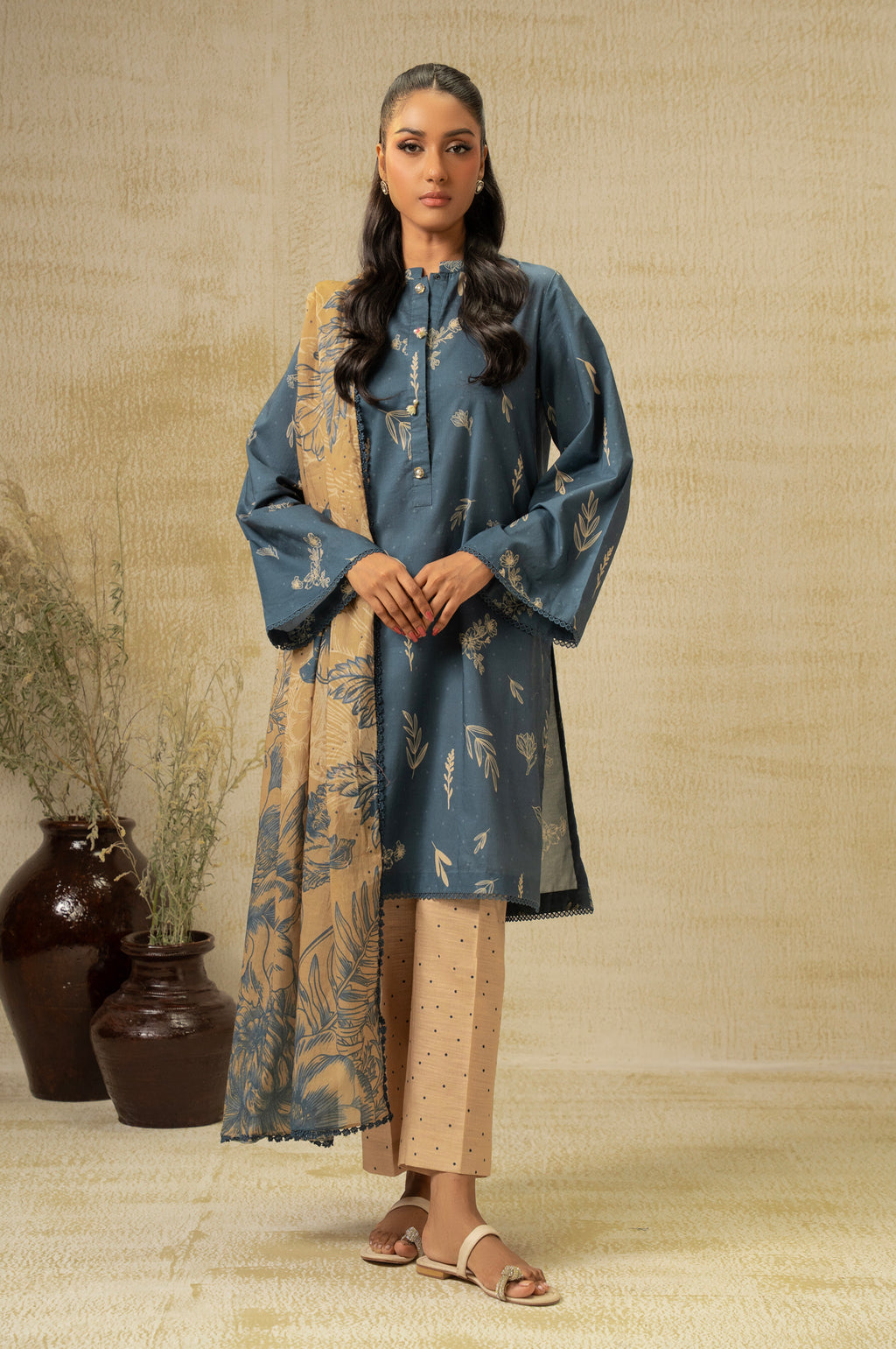 A refreshing pick for winter, this blue-colored 3-piece suit features a digitally printed viscose crepe shirt. Paired with a digital printed bottom in a soft peach hue, the suit is completed with a lightweight digital printed chiffon dupatta. This ensemble is a perfect pick for creating a breezy, soothing look for all occasions.