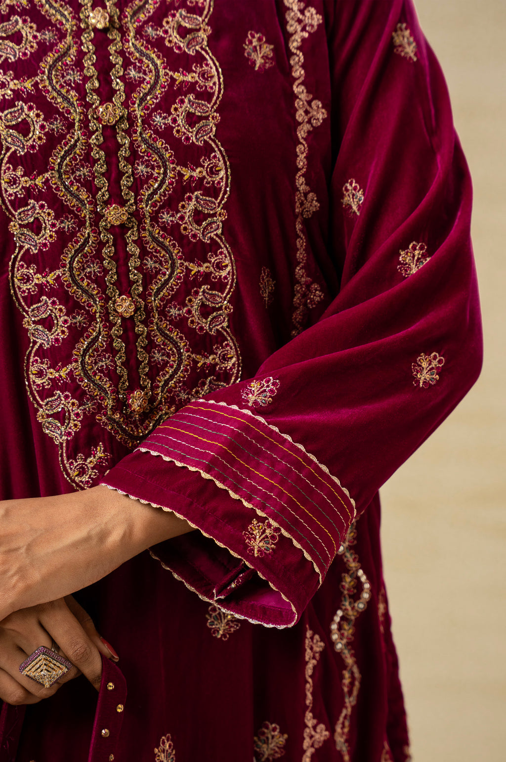 Embroidered velvet daman border for a festive touch.