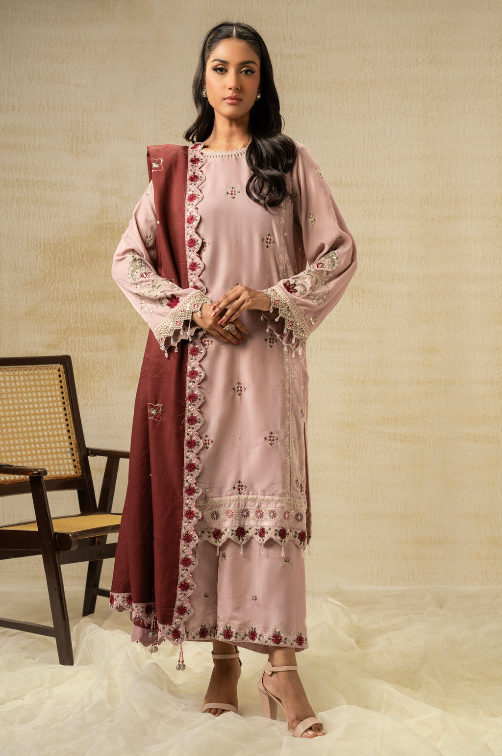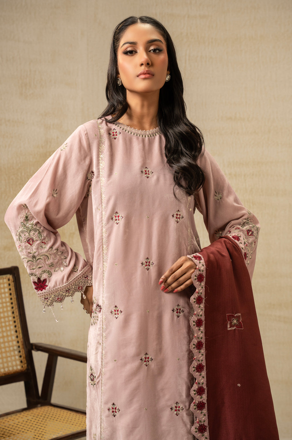 Bring a soft and graceful look to your festive wardrobe with this unstitched 3-piece velvet embroidered suit. The shirt comes with beautifully embroidered velvet center and side panels, along with detailed sleeves and borders for a rich finish. A matching embroidered velvet bottom adds a coordinated and elegant touch. The set includes an embroidered herringbone shawl in a deep maroon shade that adds contrast and charm. Made from velvet, the fabric feels smooth and luxurious to work with. This suit is ideal for formal and special occasions and can be stitched in your preferred style. It is easy to care for with hand wash and warm ironing.